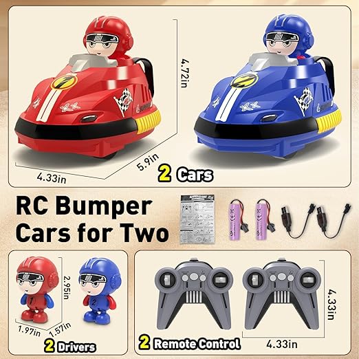 - 🚗【2PK RC BUMPER CARS】toddler remote control car comes in a pack of 2 pieces, which can be shared with friends. It is an excellent toy for young children to develop social skills, logical thinking, and direction while enjoying the fun of competitions. The RC boy bumper car toy includes 2 cartoon racing cars, 2 detachable characters, 2 remote controls,1 instruction.Perfect for children aged 4-10 and above,helping adults cultivate parent-child relationships.